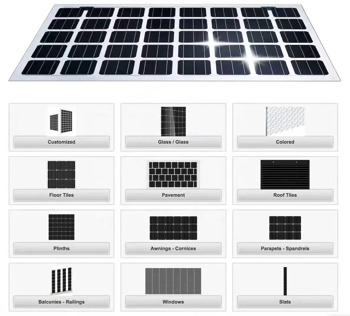 BIPV Solar Panels in Transparent or Colored Formats for Fencing, Balcony, Rooftop Tiles, and Facades provide a versatile and sustainable solution for modern architecture. Available in double-glass, flat, or curved designs, these panels generate electricity while enhancing building aesthetics and functionality. Suitable for residential, commercial, and public projects, they contribute to carbon reduction, energy efficiency, and smart city development, transforming ordinary building surfaces into renewable energy infrastructure. Customizable in size, color, transparency, and frame design, BIPV panels integrate seamlessly with contemporary architectural demands, supporting green building initiatives and net-zero energy goals.